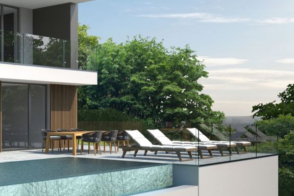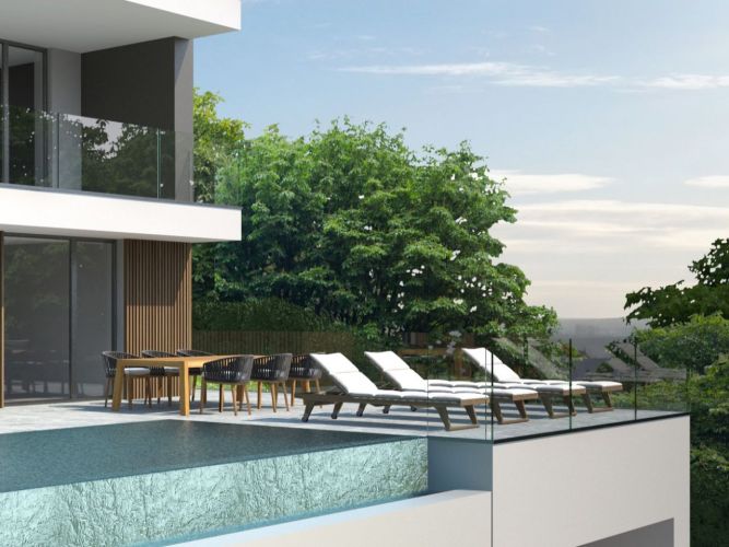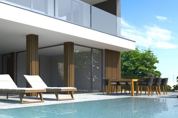 The beautiful and bright living area has large windows, terrace, kitchen, two bedrooms and two bathrooms and garden, with staircase which connects the lower floor which consists of large room with bathroom, hobby room (alternatively it can be used as a gym / bar / kitchenette ), covered outdoor living, solarium and swimming pool.